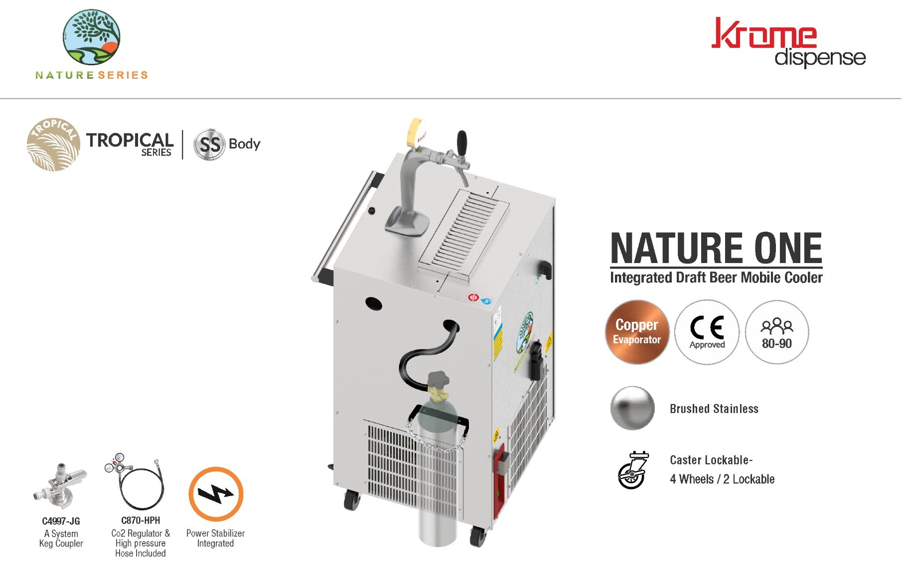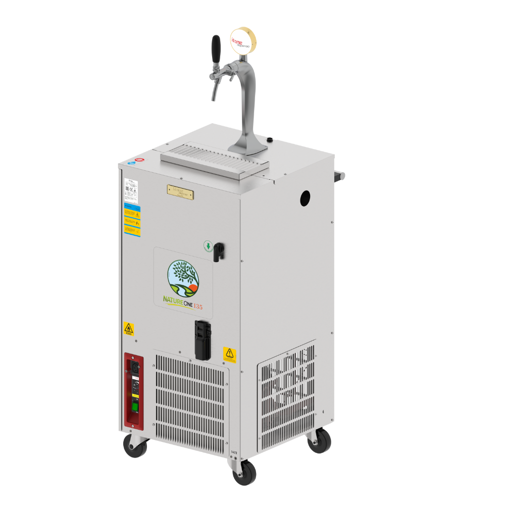 Krome Nature One – 135 LPH Mobile Draft Beer Cooler on Wheels (Single Tap) Compact 135 LPH mobile draft beer cooler with stainless steel body, illuminated single-tap tower, and integrated CO₂ system,and A type Coupler Included designed for reliable beer dispensing at events, hotels, and outdoor venues.